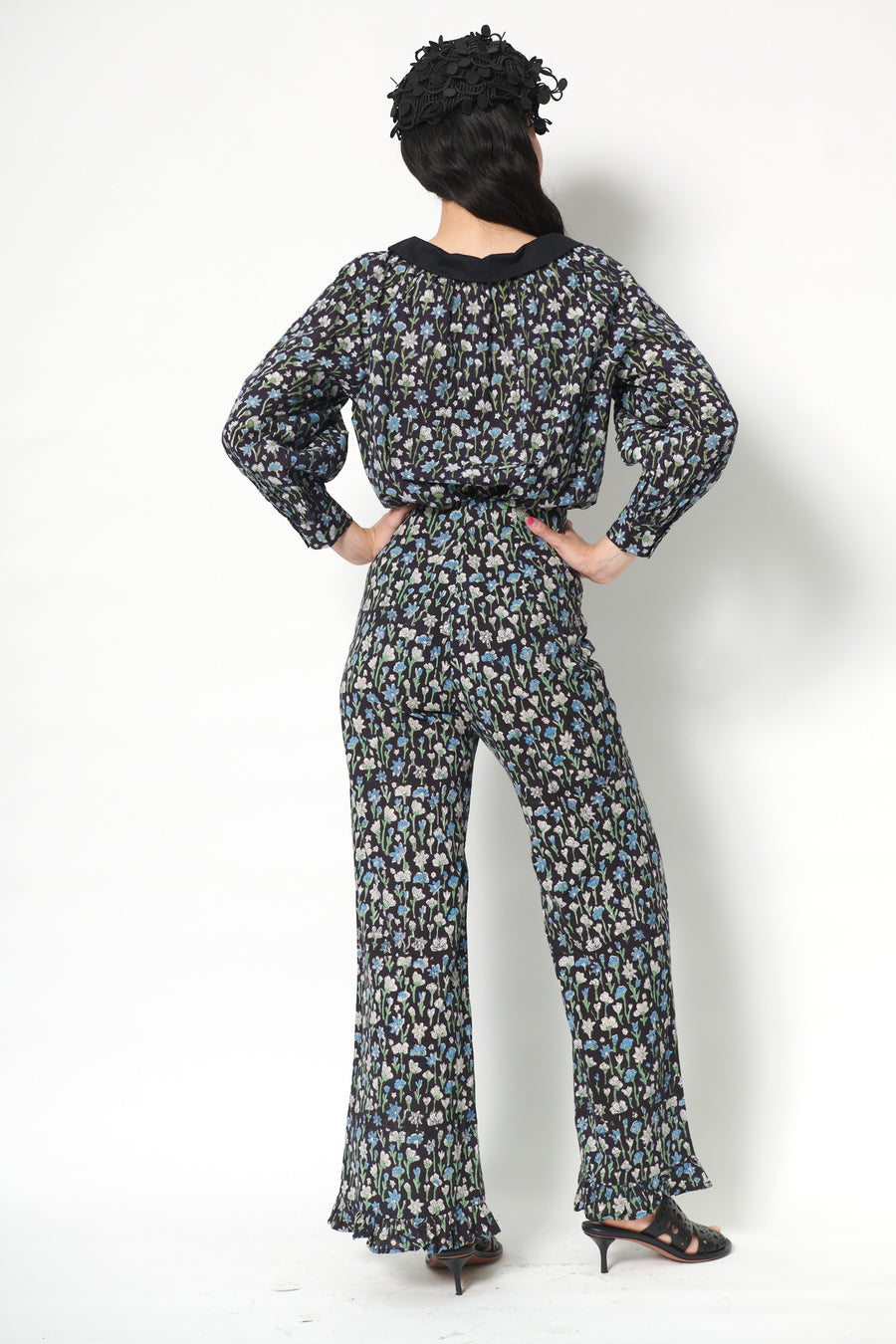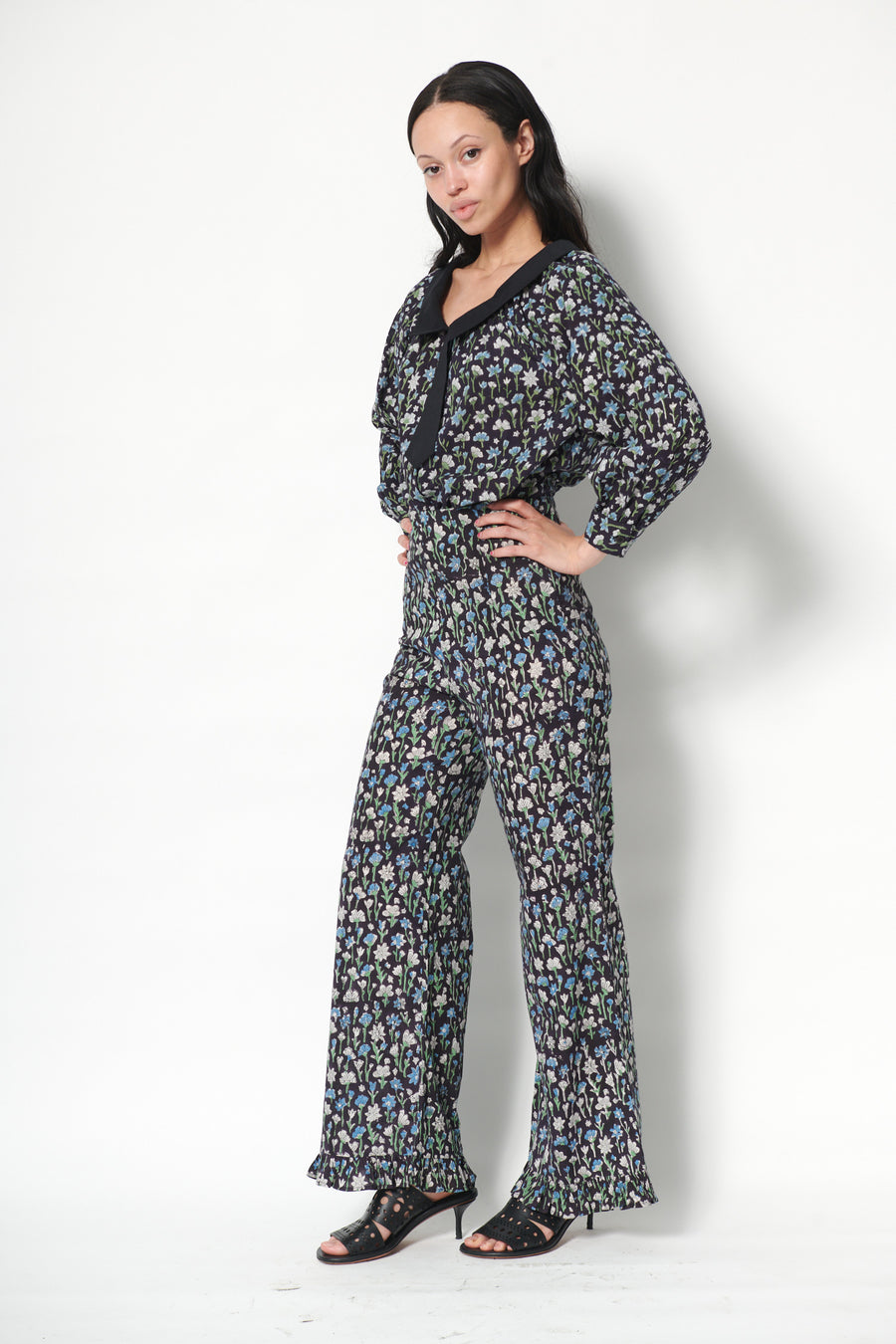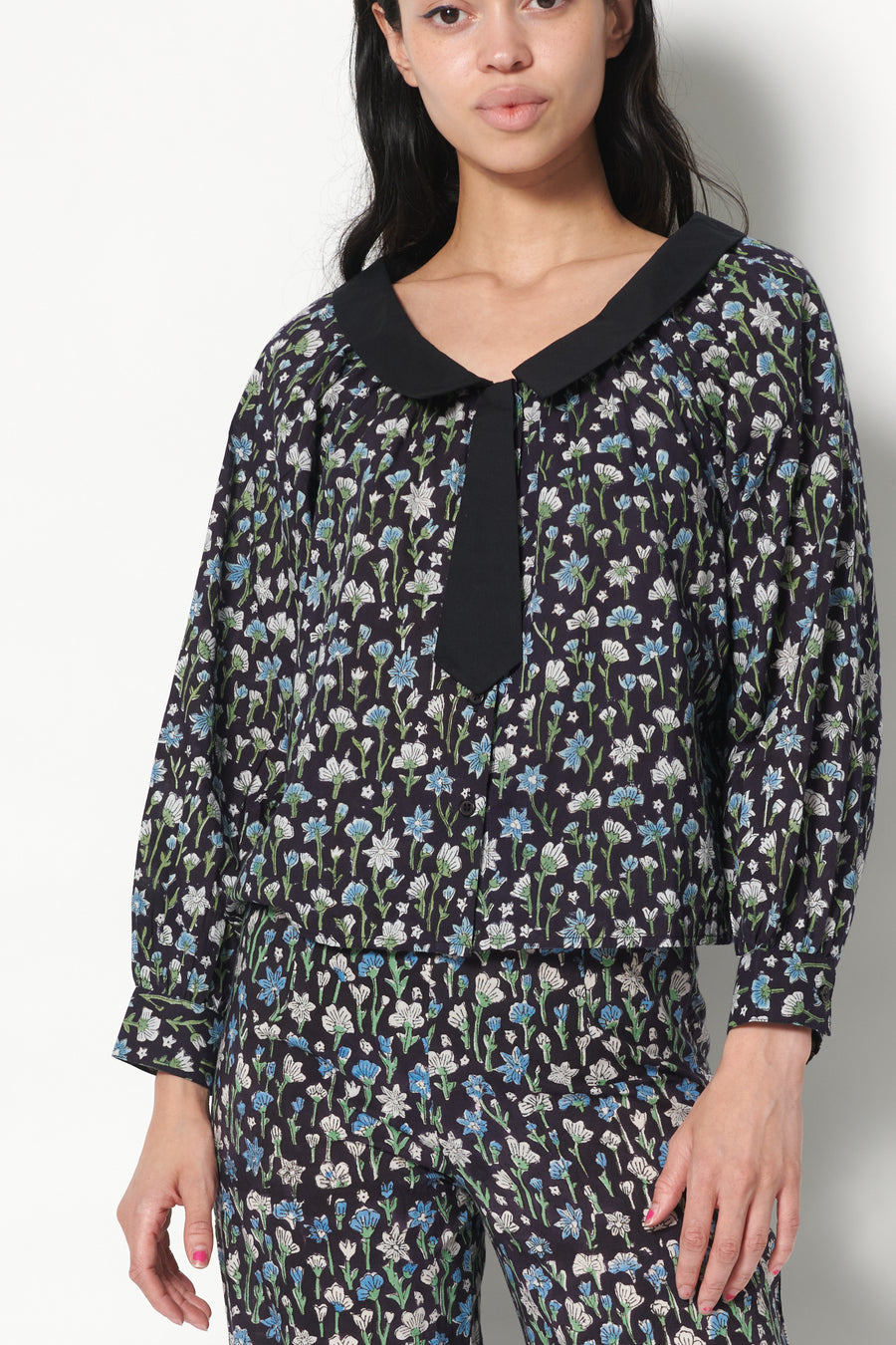Collared shirt in a soft black cotton voile in floral block-print with collar and attached tie detail in black voile. 3/4 Sleeves and button closure down center front with snap button near tie. Pairs with matching Ruffle Pant.