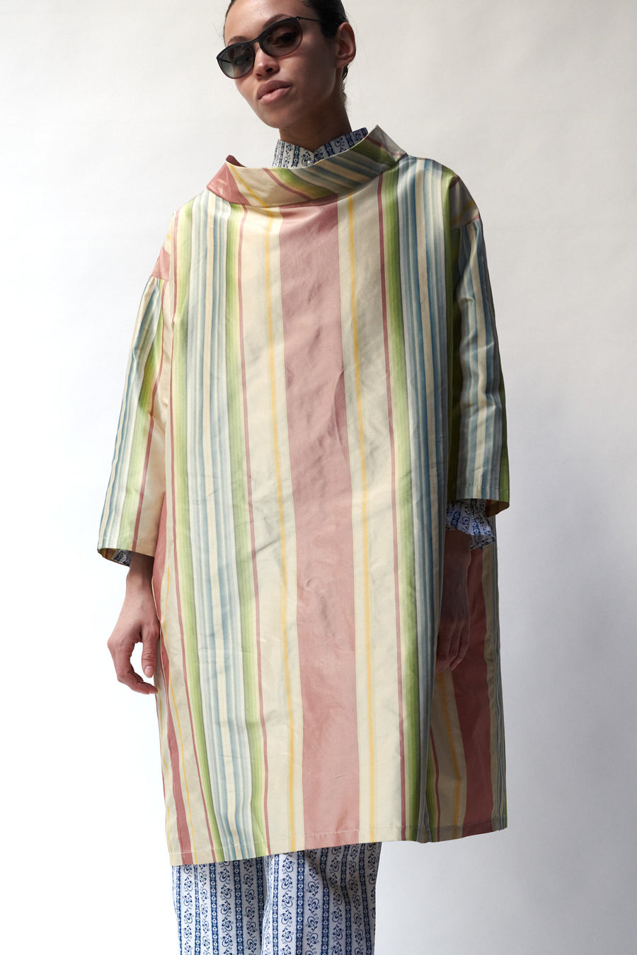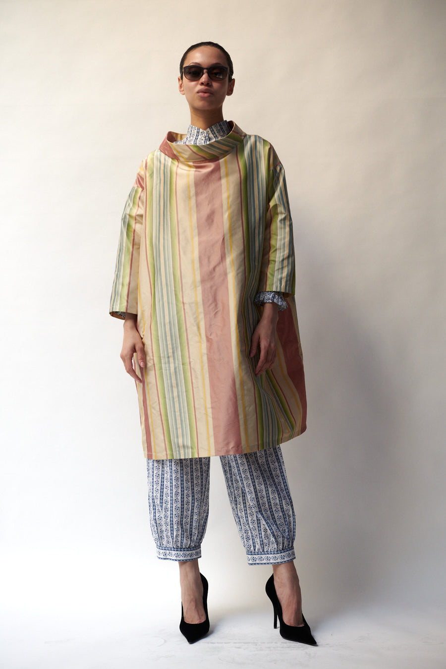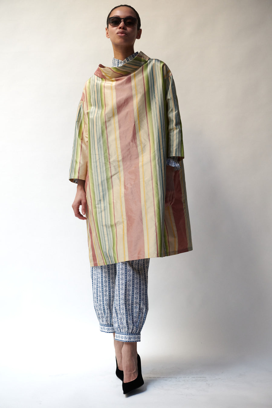 Tent dress in striped silk taffeta fabric with a dramatic shawl collar.  Worn over the Anja Skirt, Grace Blouse and Lucette Pant.
