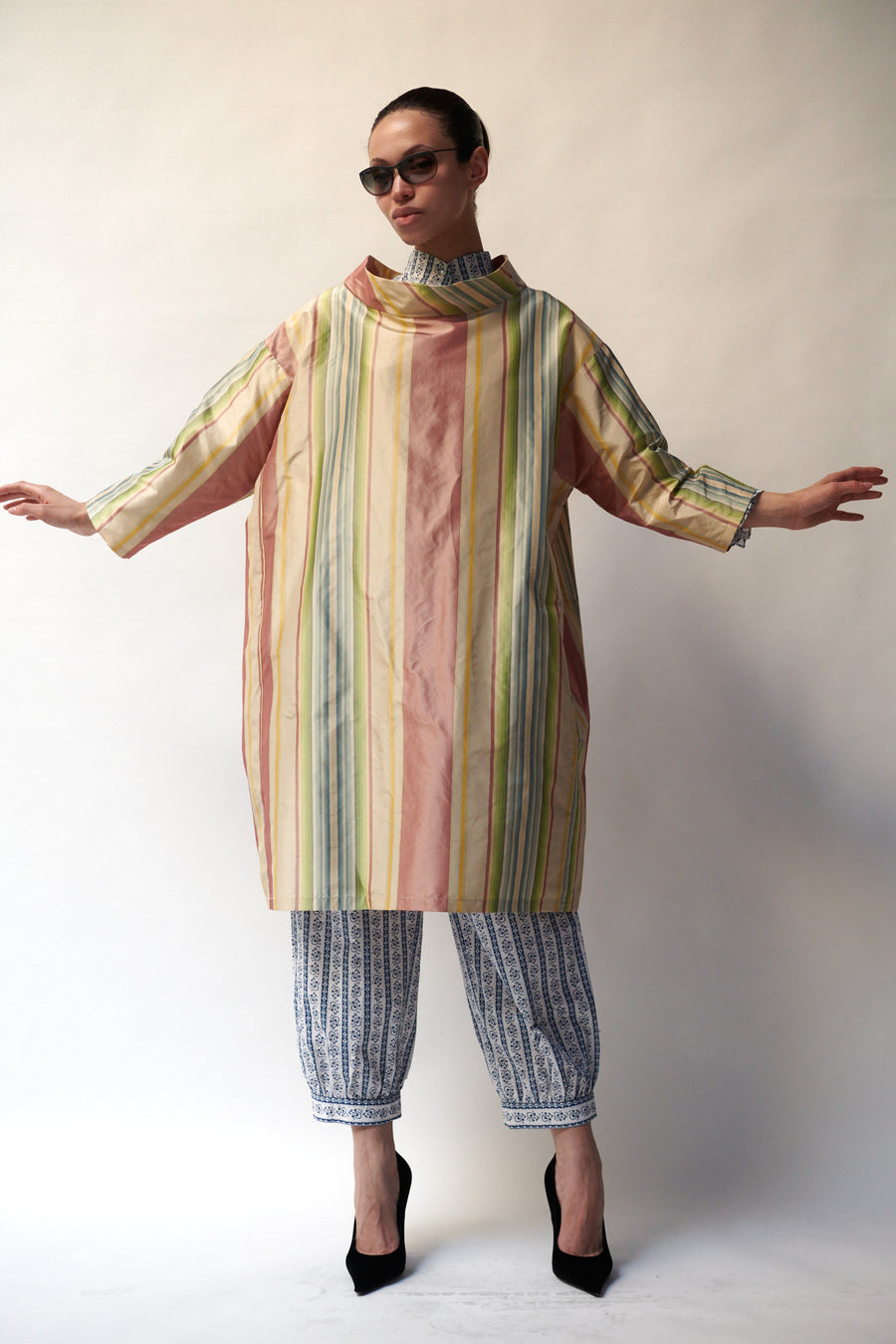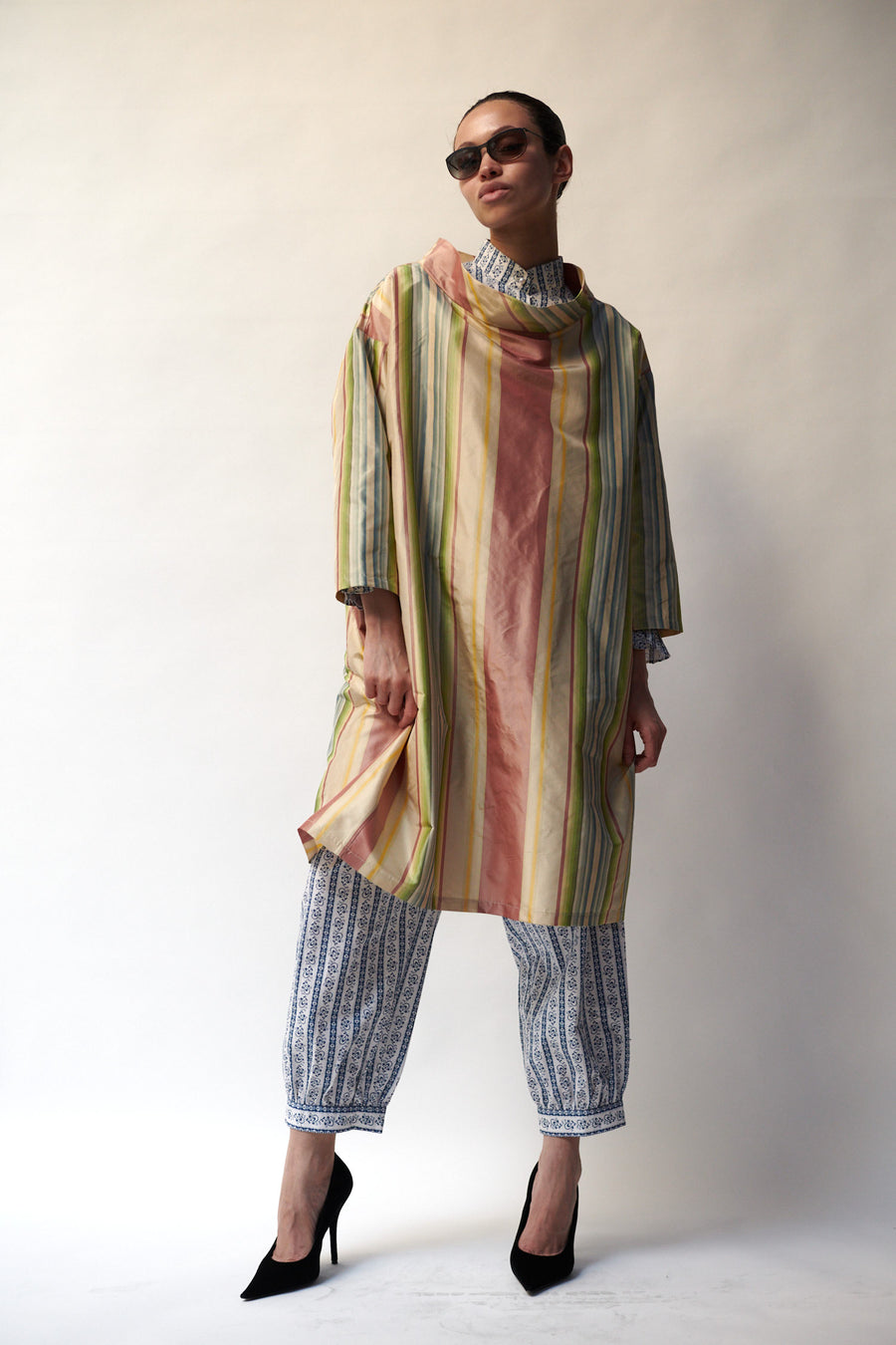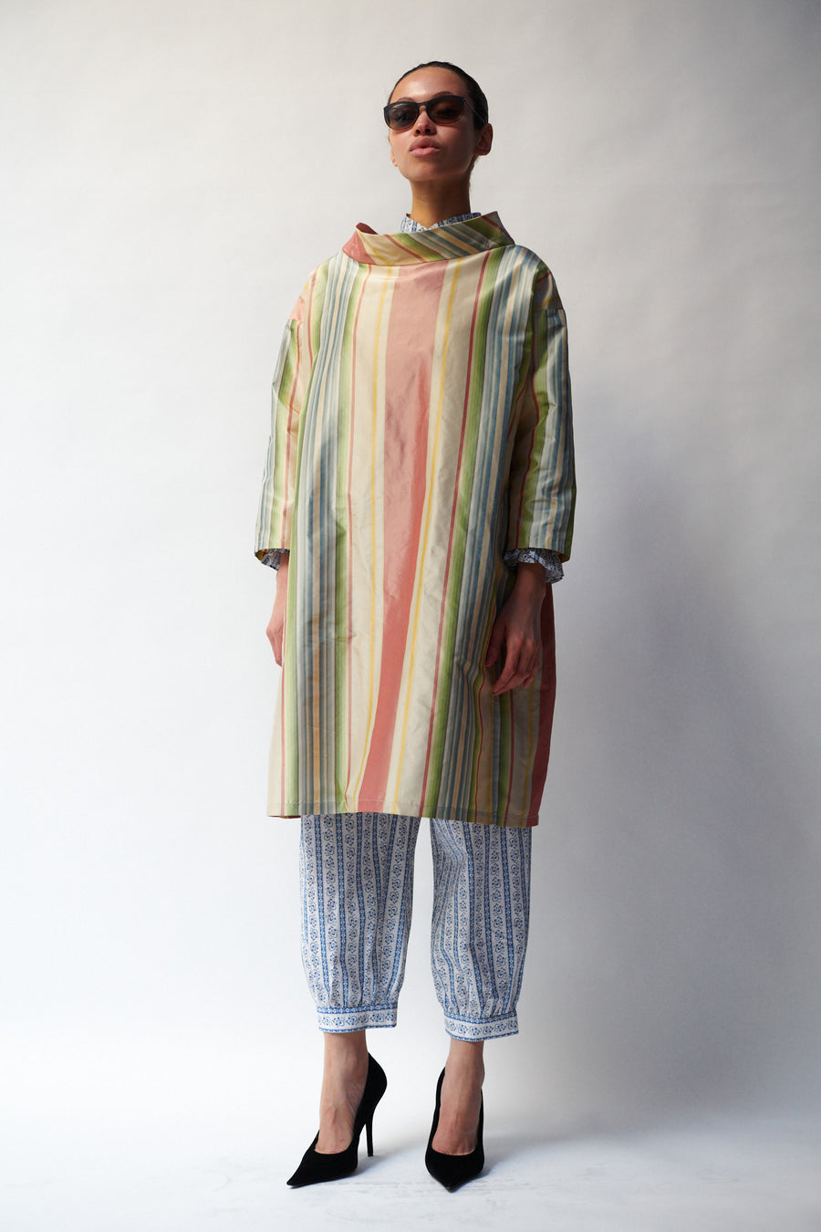 Tent dress in striped silk taffeta fabric with a dramatic shawl collar.  Worn over the Anja Skirt, Grace Blouse and Lucette Pant.