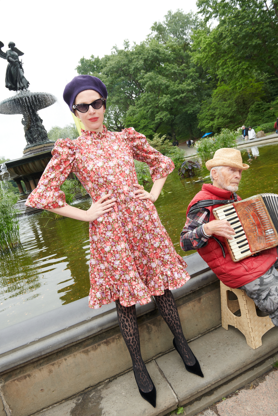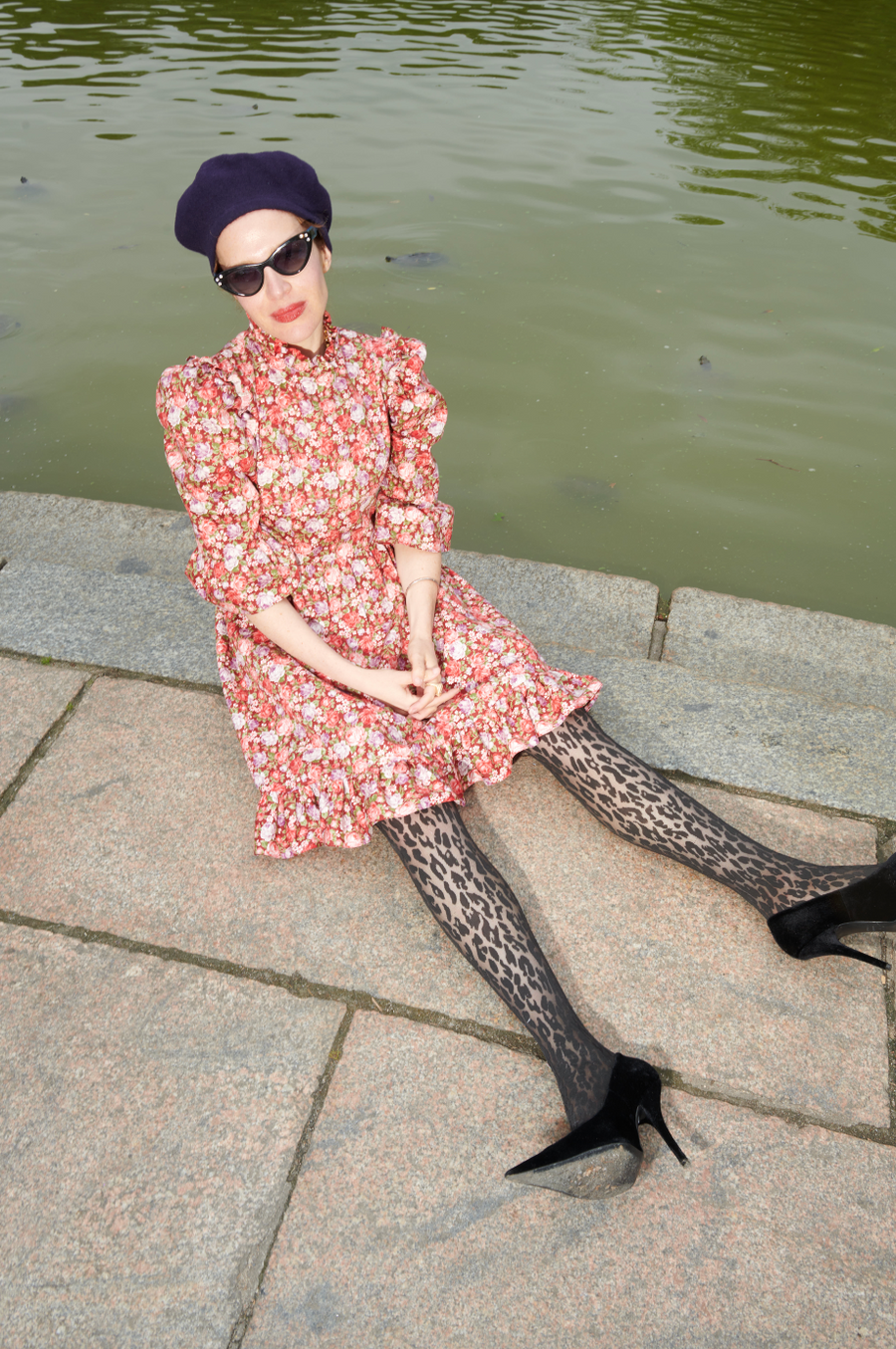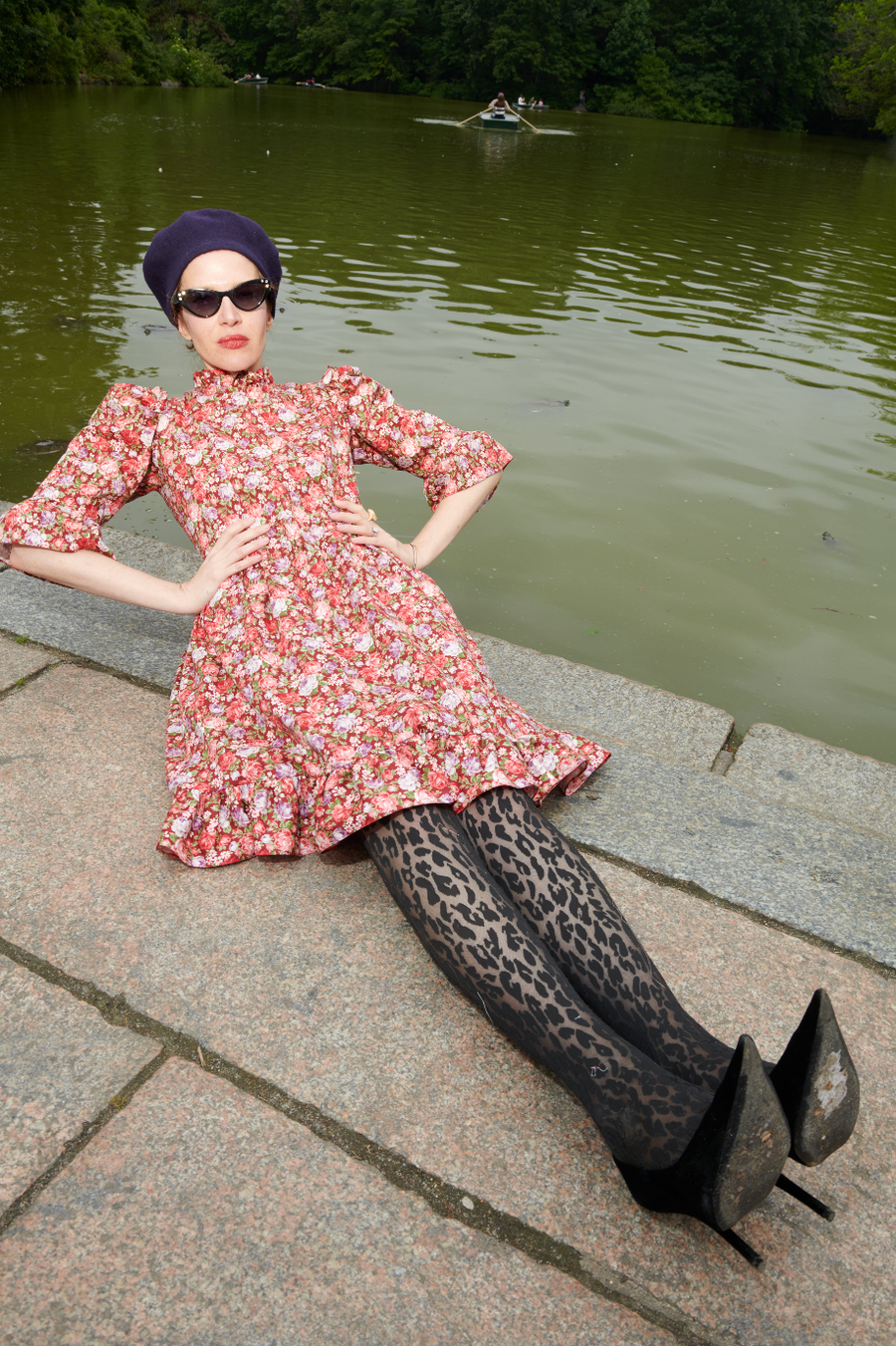 Batsheva's classic ruffled prairie dress in burgundy floral-printed cotton with puff sleeves. Ruffles at collar, cuffs, and hem. Side-seam pockets. Knee length. Zipper at back.