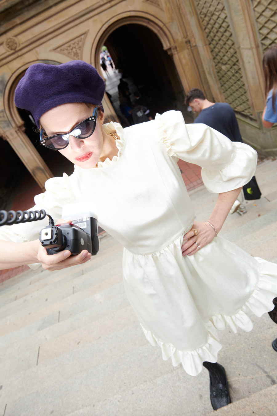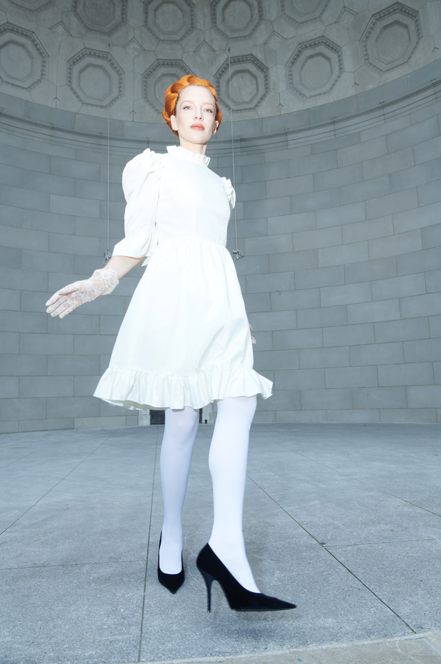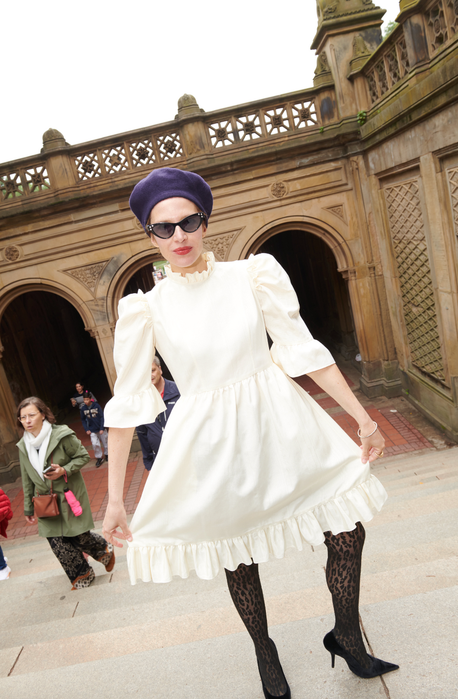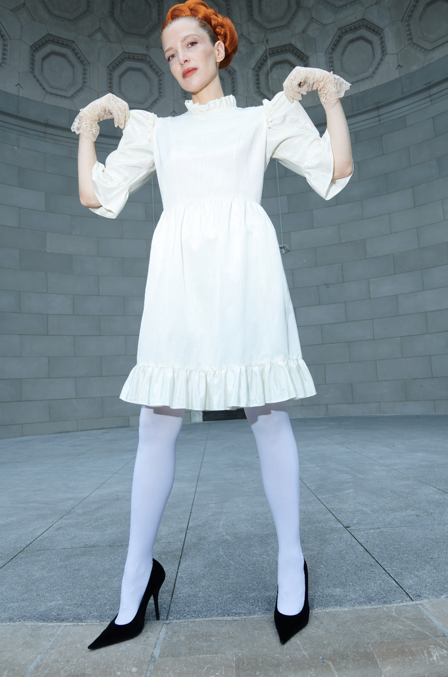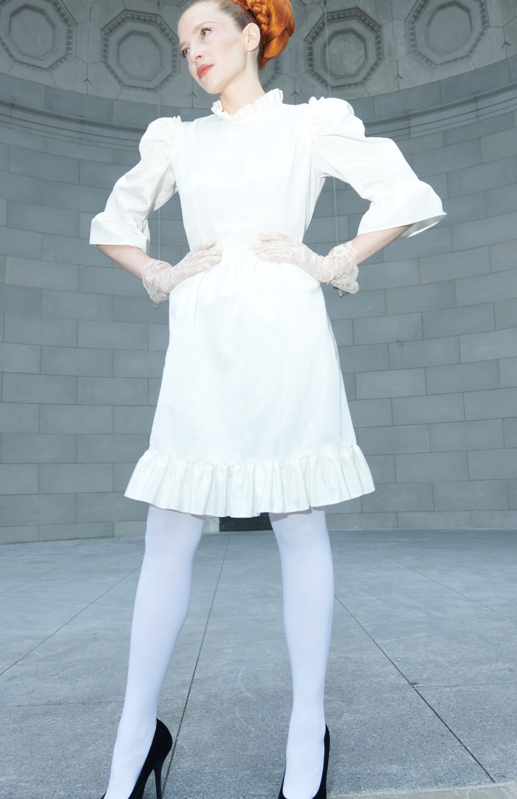 Ruffled prairie dress in ivory moiré fabric with puff sleeves. Ruffles at collar, cuffs, and hem. Side-seam pockets. Knee length. Zipper at back.