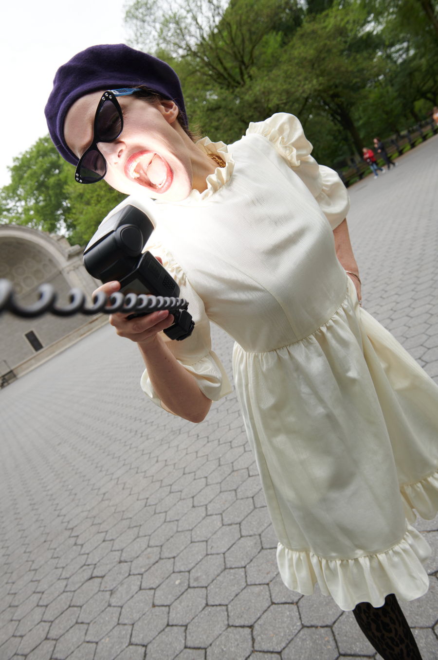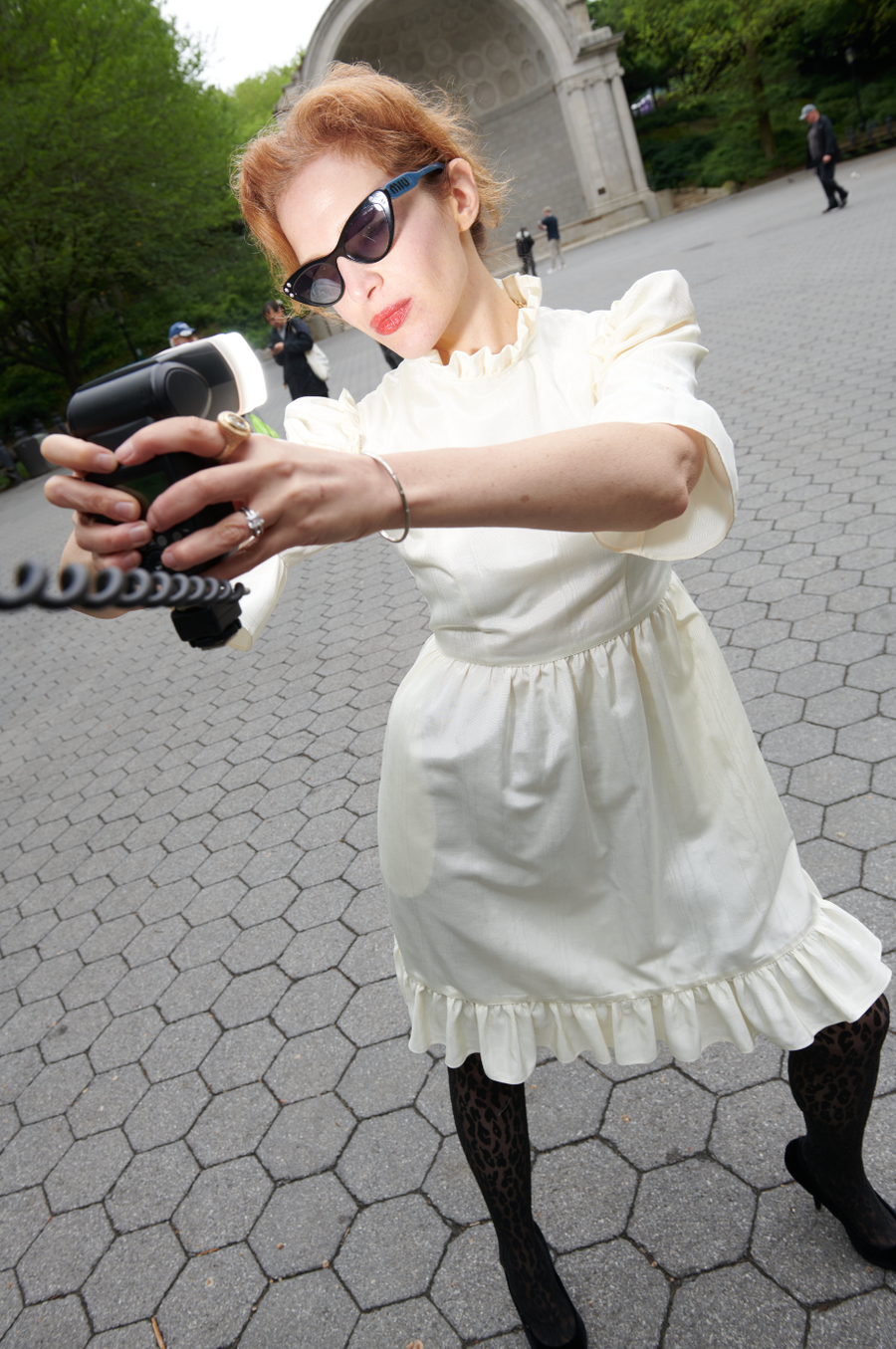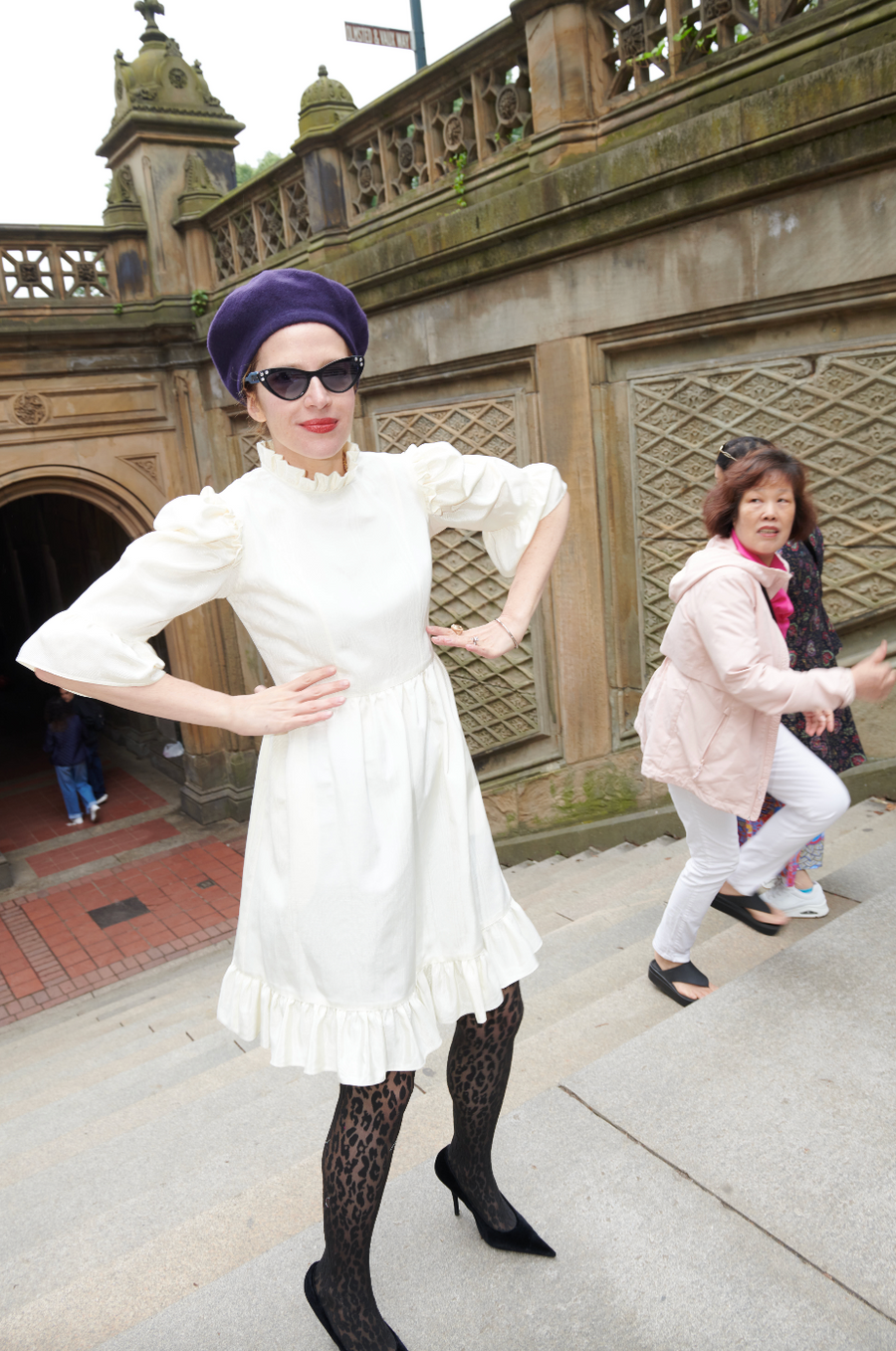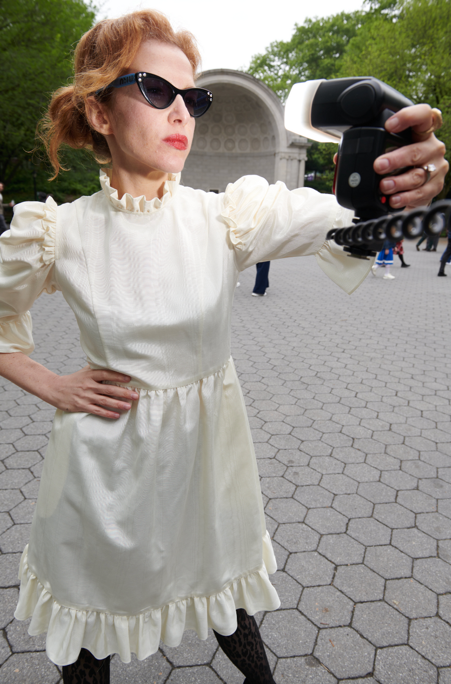 Ruffled prairie dress in ivory moiré fabric with puff sleeves. Ruffles at collar, cuffs, and hem. Side-seam pockets. Knee length. Zipper at back.